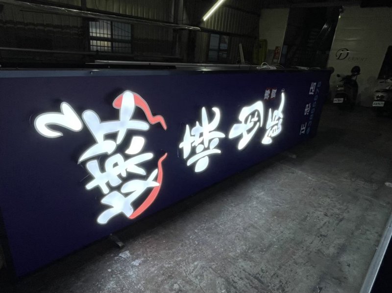 正發光立體字:發光效果是正面發光,給人感覺較為大器,通常的作法是壓克力做面板+金屬圍邊,正面如果要有顏色,可以貼卡典或是大圖輸出使之正面有不同顏色。